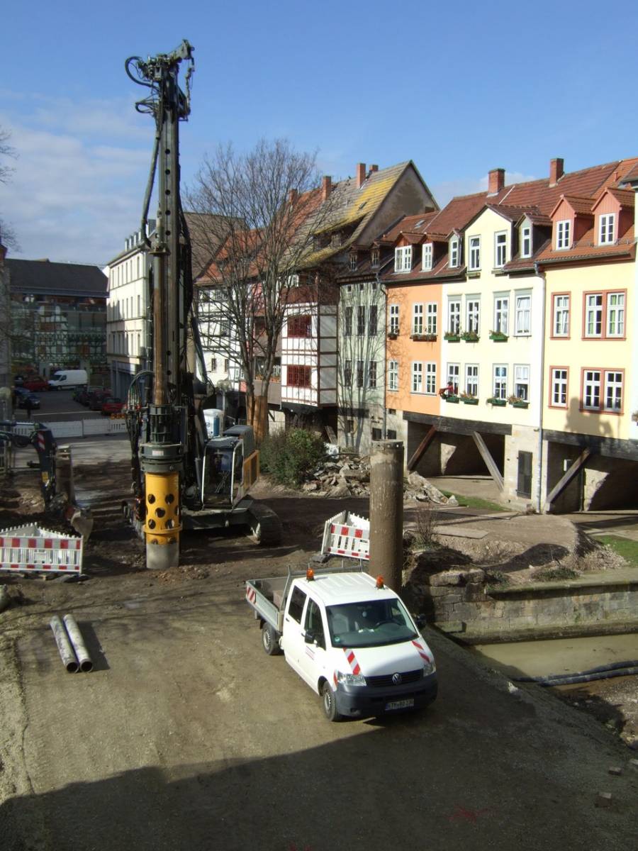 Das Foto zeigt das Bohrgerät zur Herstellung der Bohrpfahlgründung unterhalb der Brückenwiderlager im Frühjahr 2016.